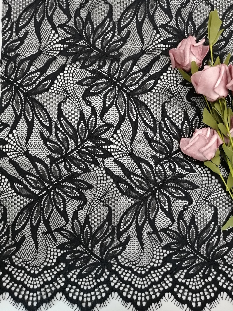 -Leafy pattern Lace Chantilly Lace Eyelash lace with scallop Lace Black can meet the requirement of OEKO-Tex Standard 100 .