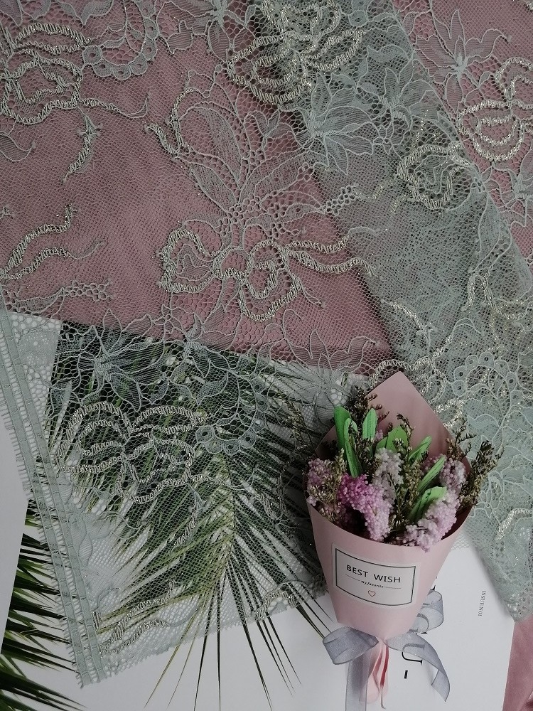 - Delicate French Chantilly Eyelash Metallic Lurex Lace fabric with scallop Dress fabric can meet the requirement of OEKO-Tex Standard 100 .