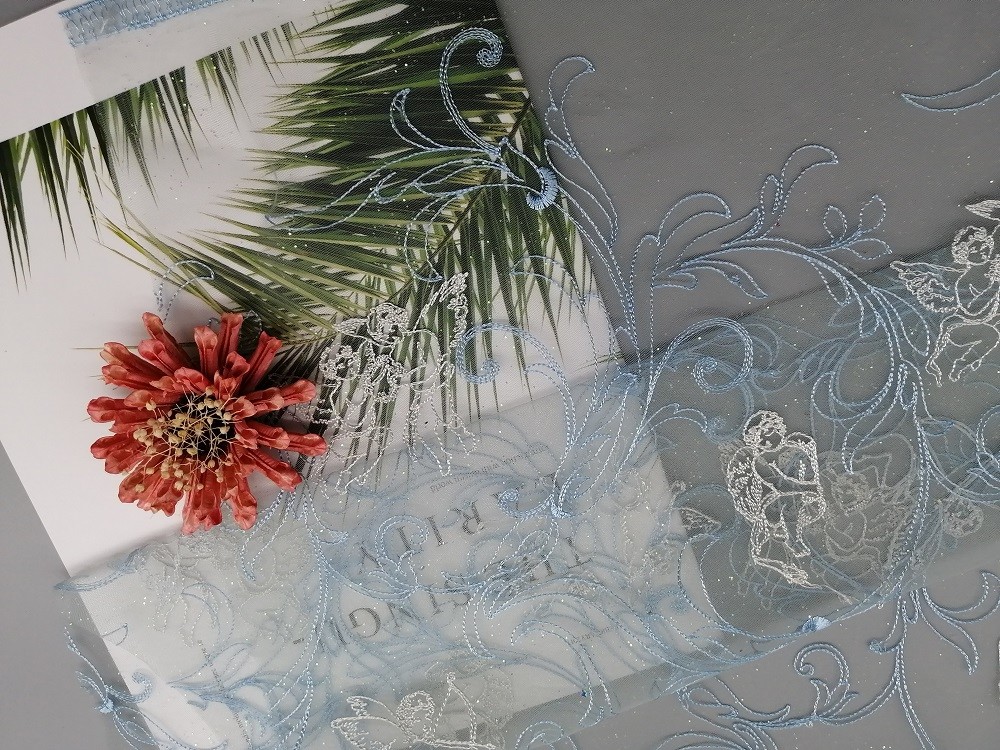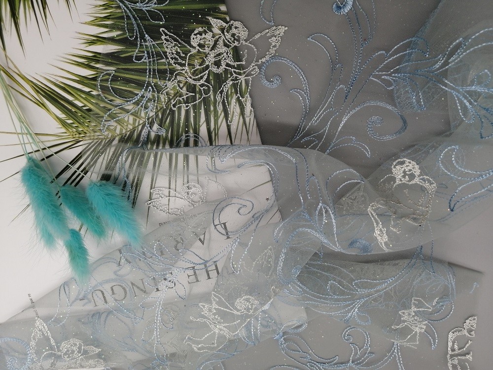 - Bule Tulle Mesh Foil Printed Foil Coated Embroidery Fabric whole sellers for Garment Brands meet the requirement of OEKO-Tex Standard 100 .