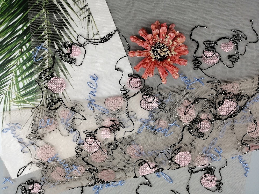 - Multi Colored Tulle Mesh Embroidered Lace fabric with letters for Garment Brands the requirement of OEKO-Tex Standard 100 .