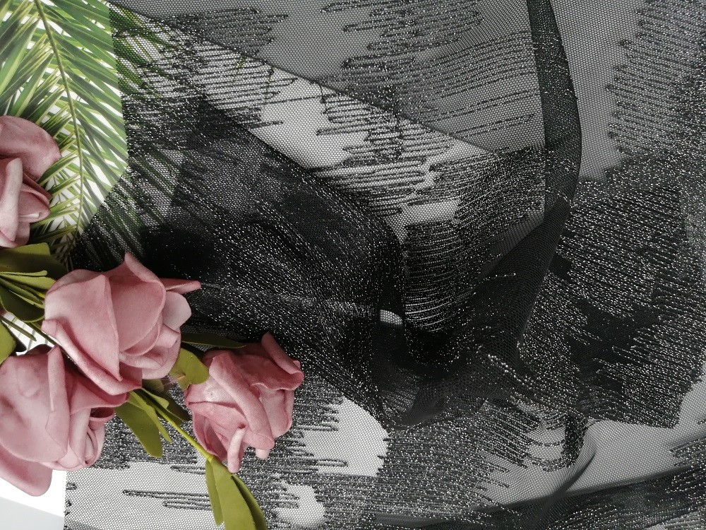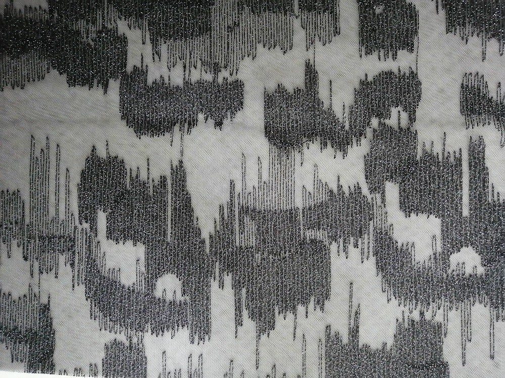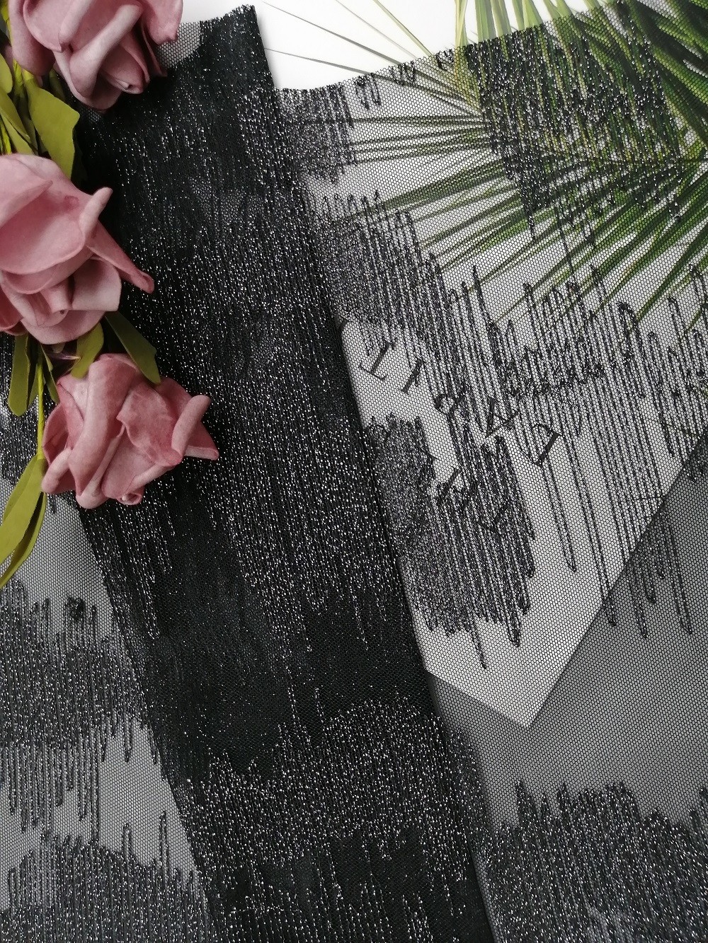 - Black Metallic Lurex Silver Yarn Geometric Line Embroidered Lace Fabric for Lady's Garment Female Dresses ,Skirt, Little Girls dresses , Home Textiles, Curtain, Bedding Articles, Apparels, Hats ,Wedding Dresses, Blouses, etc.