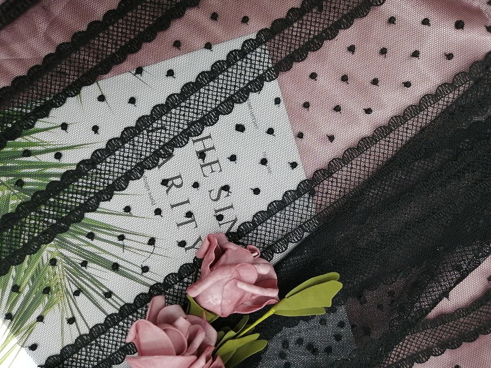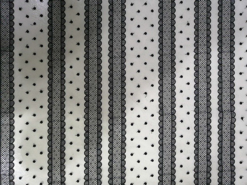 - Black Dot Line Geometric Tulle Mesh Embroidered Lace Fabric for Lady Garment Home Textile Little Girl Dress can meet the requirement of OEKO-Tex Standard 100 .