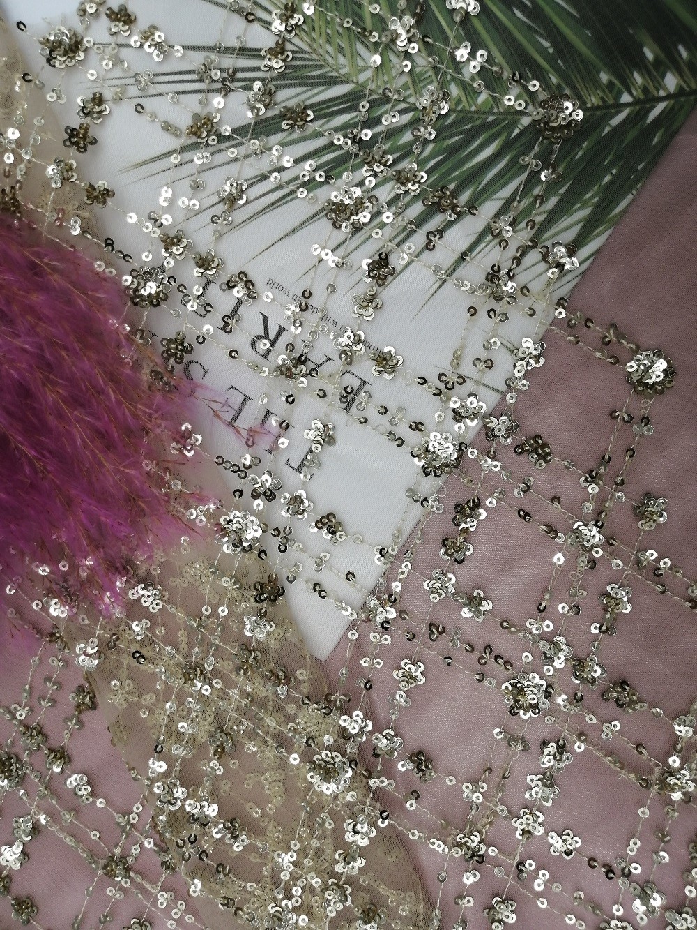 Gold Flower Sequin Embroidered Fabric for Evening Dress Lady Garment Home Textile Little Girl Dress Specifications: