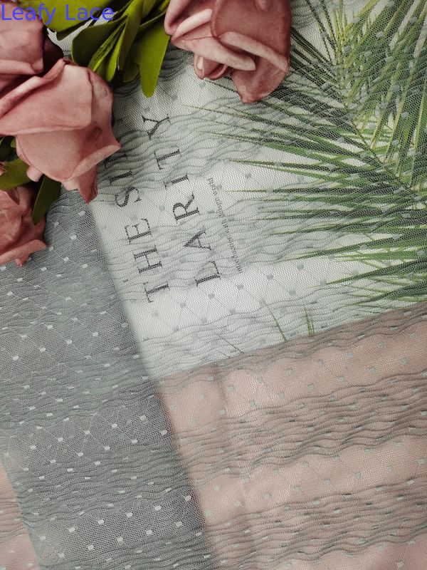 - Grey Polyester Crinckle Pleated Mesh Pleated Lace Fabric for Evening Dress Lady's Dress Garment Brands Little Girl Dress can meet the requirement of OEKO-Tex Standard 100 .