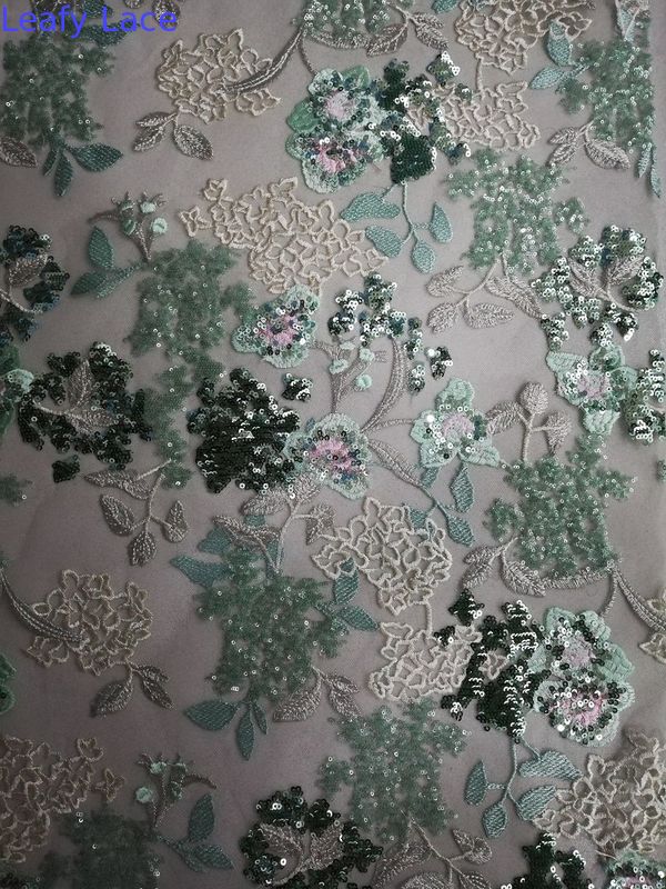 Green Floral Sequin Embroidered Fabric Party Fabric for Evening Dress Lady's Dress Garment Brands Little Girl Dress can meet the requirement of OEKO-Tex Standard 100 .