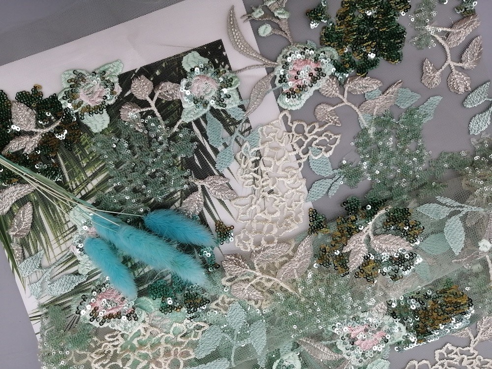 Green Floral Sequin Embroidered Fabric Party Fabric for Evening Dress Lady's Dress Garment Brands Little Girl Dress is for Home Textiles, Curtain, Bedding Articles, Apparels, Hats ,Wedding Dresses, Blouses, Lady's Garments , Tablecloth, Little Girls Dresses , Fashion Female Shoes , Pants , Trousers , Shorts , Jackets, etc.
