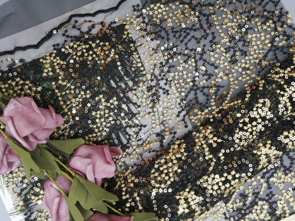 Black Embroidery Party Fabric Sequin Embroidered Fabric for Evening Dress Lady's Dress Garment Brands Little Girl Dress is for Home Textiles, Curtain, Bedding Articles, Apparels, Hats ,Wedding Dresses, Blouses, Lady's Garments , Tablecloth, Little Girls Dresses , Fashion Female Shoes , Pants , Trousers , Shorts , Jackets, etc.