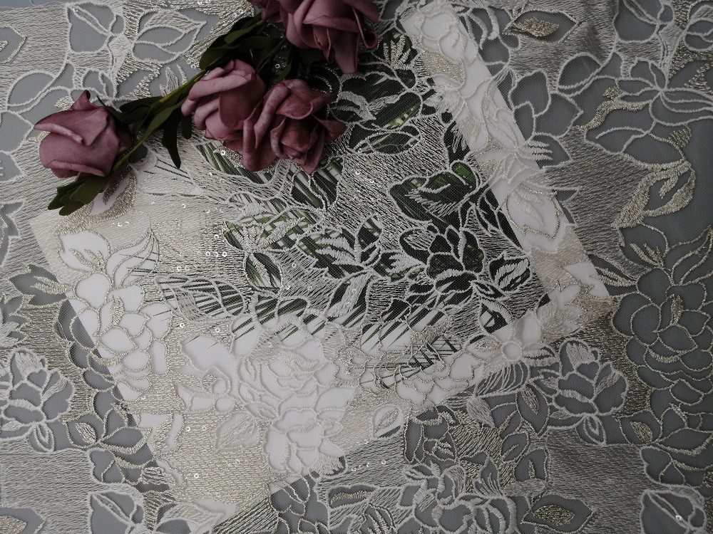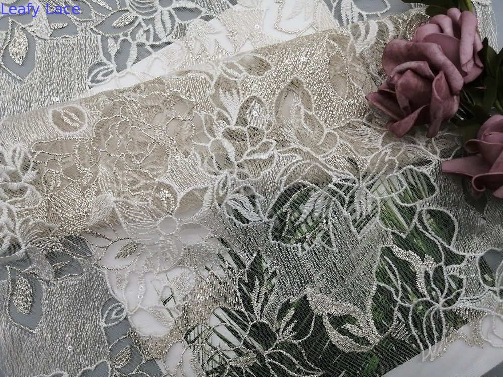 Ivory Lurex metallic Lace Fabric Party Fabric Sequin Embroidered Fabric For Wedding Dress Lady dress Decoration garment is suitable for Women Dresses, Skirt, Little Girls dresses , Home Textiles, Curtain, Bedding Articles, Apparels, Hats ,Wedding Dresses, Blouses, etc.