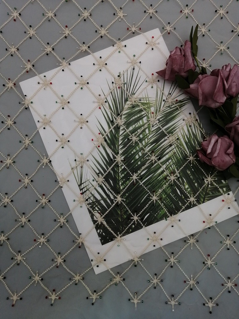Colored Bead Embroidery Fabric Geometric Embroidery Lace Evening Dress for Women Long Skirt Dress Garment Little Girls Dresses, Home Textiles, Curtain, Bedding Articles, Apparels, Hats ,Wedding Dresses, Blouses, e