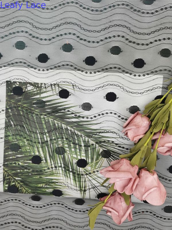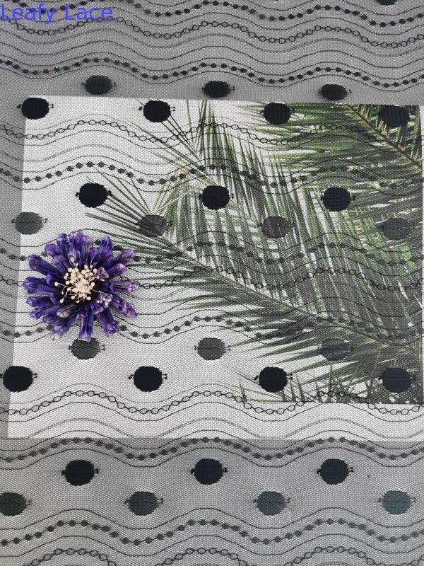 Linear and all over spot Lace Polyester Lace Trim Black Tulle Mesh for Women Long Skirt Dress Garment Little Girls Dresses, Home Textiles, Curtain, Bedding Articles, Apparels, Hats ,Wedding Dresses, Blouses, Even Men Shirt ,etc.