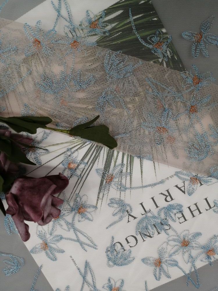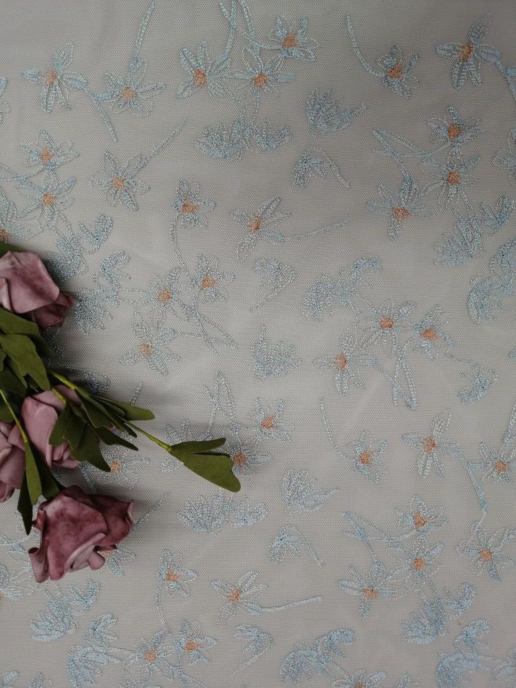 -Artwork: It is 2colors PP thread together with good net Tulle fabric . Beige background , light blue small flower with the orange stamen creats a amzing pattern . Once production , it becomes a best-seller in our collection . It also will bring a success on your garment .