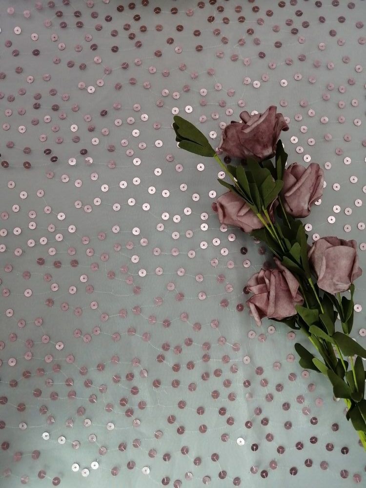 pink Transparent Sequin Embroidered Fabric Organza Tulle Emrboidery is for Women Long Skirt Dress Garment Little Girls Dresses, Home Textiles, Curtain, Bedding Articles, Apparels, Hats ,Wedding Dresses, Blouses, Even Men Shirt ,etc.