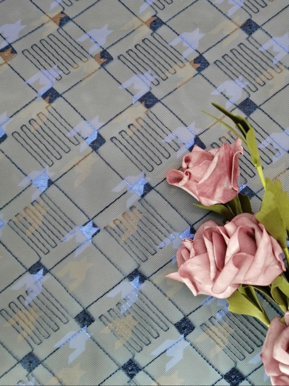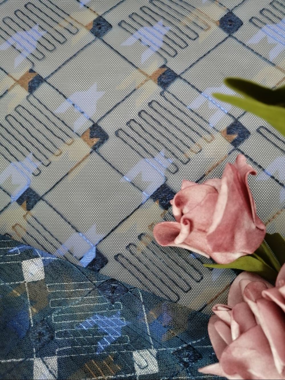 Digital printing grid Tulle Artwork and production process : Firstly we make embroidery on the tulle backgroud and then we make digital printing on the embroidered mesh .The grid patern is simple &fashionable . It will not be out of fashion in short time .