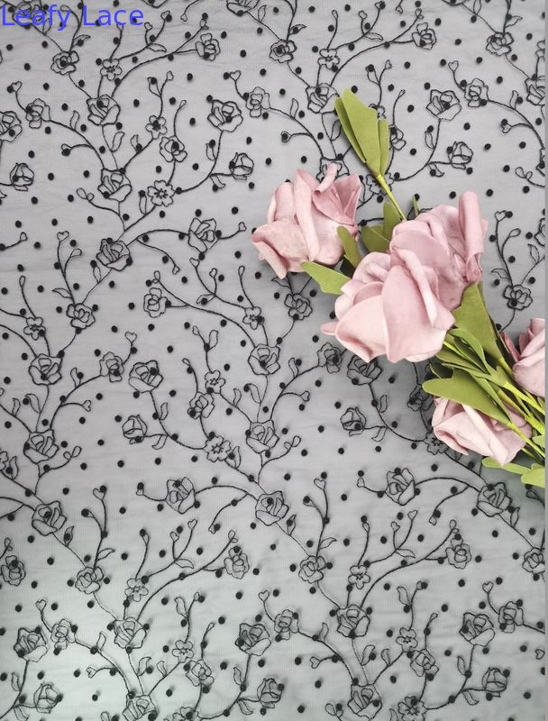 Fancy Tulle Flocked Lace Fabric Black Flower Embroidered Fabric
