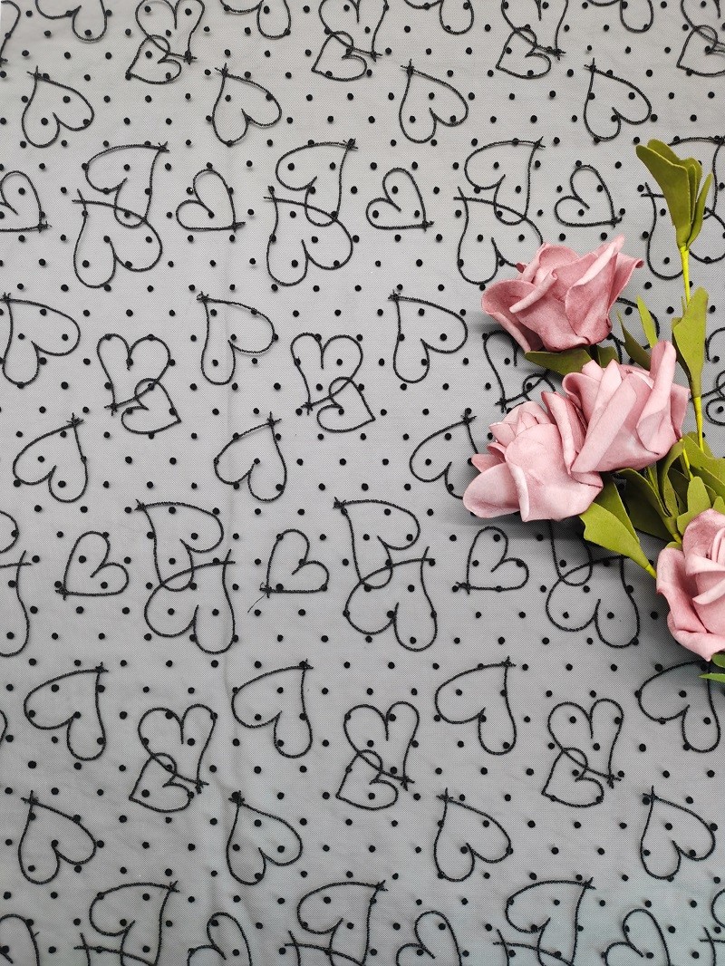 -Artwork: The Tulle mesh is in piece dye firstly , and then do the folcking on the dyed mesh . It is contrast color in black and white .