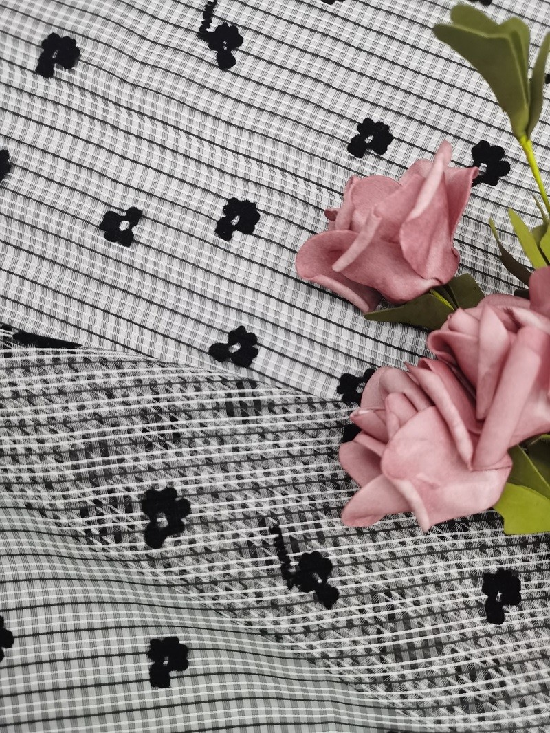-Artwork: The Flower Tulle Flocked Mesh is in piece dye firstly , and then do the folcking on the dyed mesh . It is contrast color in black and white .