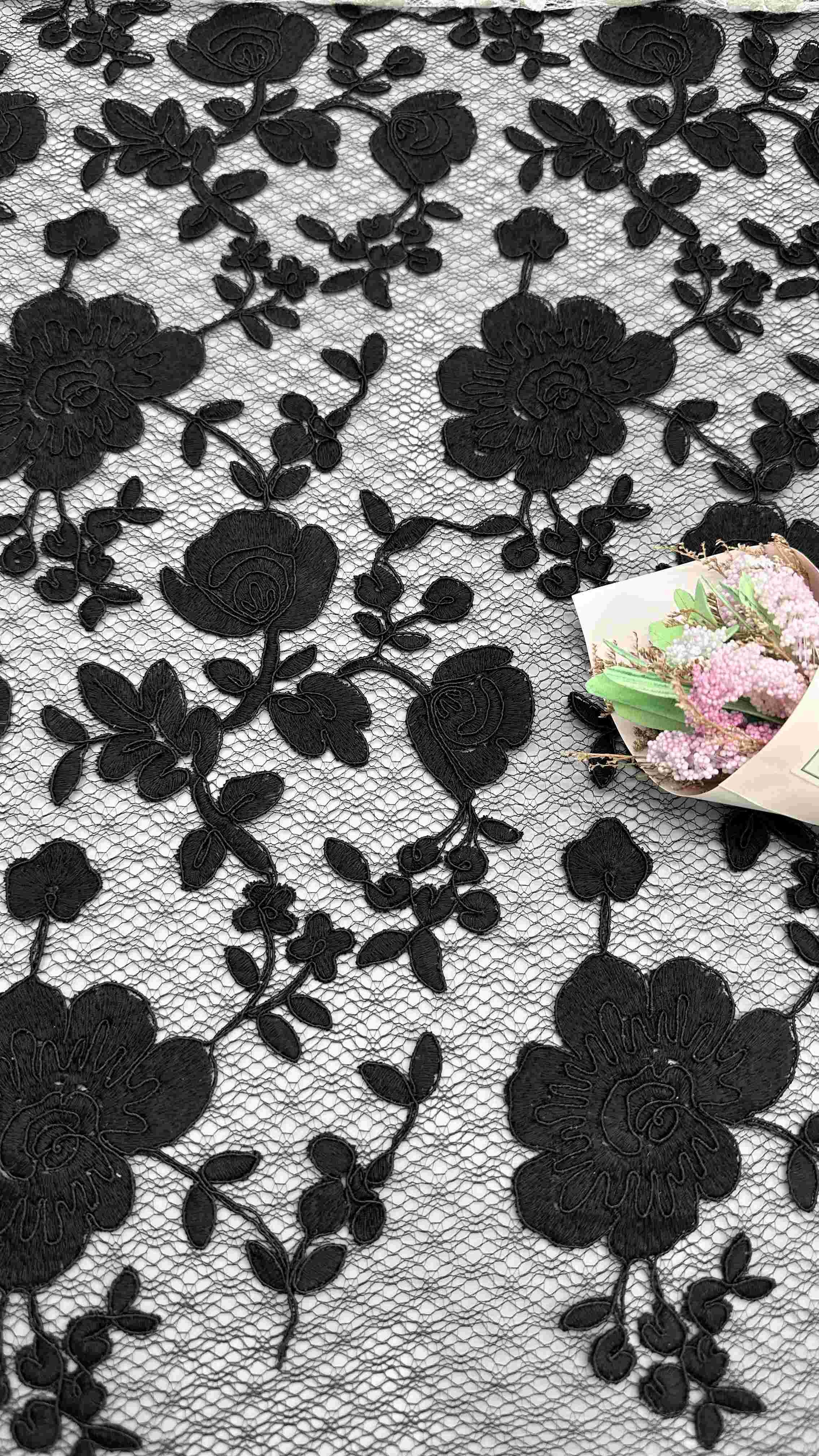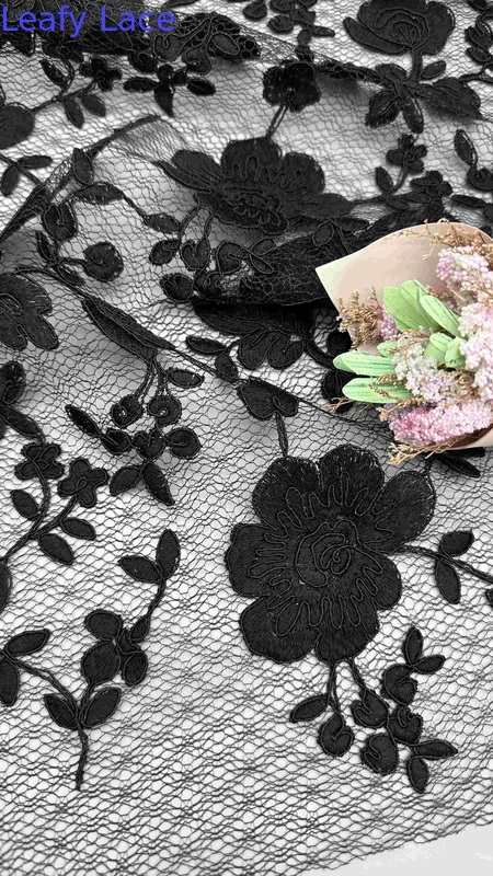 Highlight: | Floral Pattern Embroidered Mesh Lace Fabric,Black Embroidered Mesh Lace Fabric,129cm Embroidered Mesh Lace Fabric |