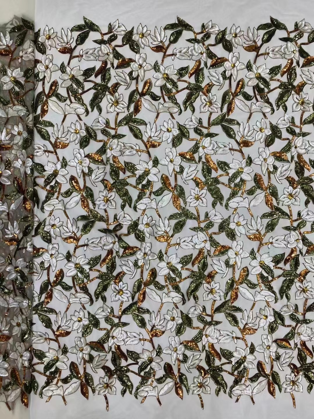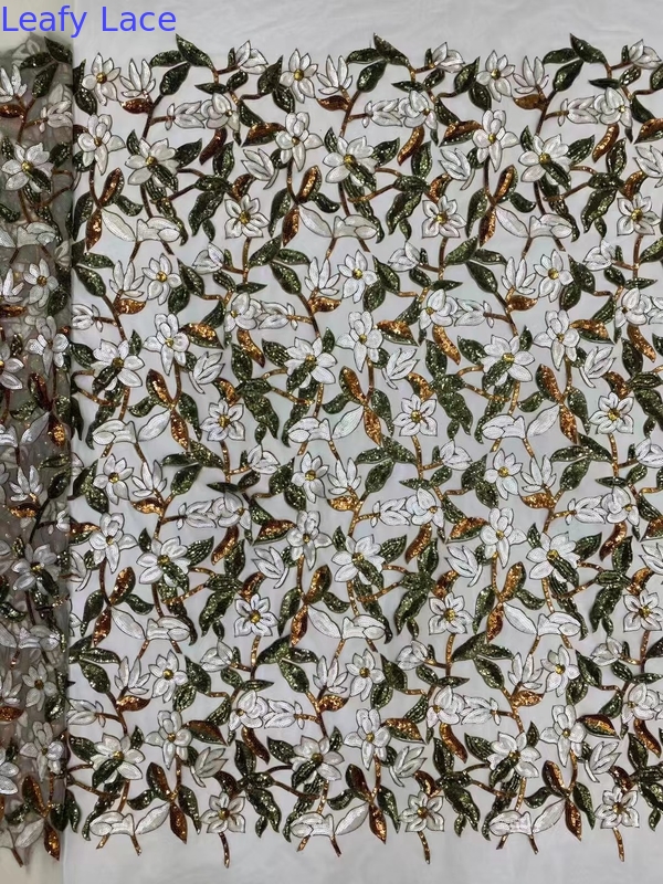 LEAFY LACE Sequin Embroidered Fabric is available for purchase at a negotiable price, depending on the quantity ordered. The product is packaged in rolls by plastic bag or as requested, and delivery typically takes 15-20 days. Payment terms include FOB, CIF, CNF, DDP, DDU, and EXW. With a supply ability of 30000 yards/month, this fabric is the perfect choice for those looking for a high-quality product at an affordable price.