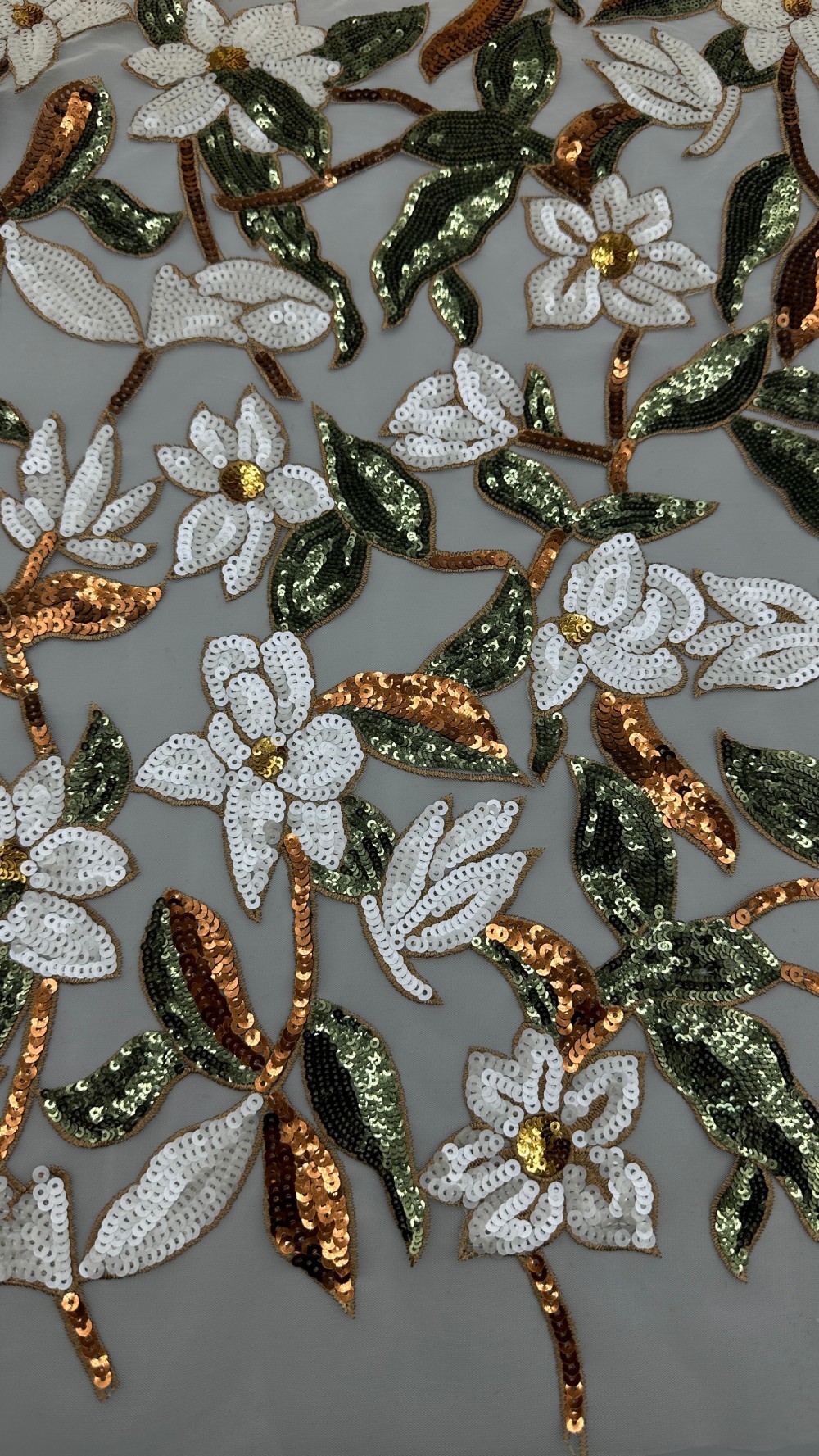 The fabric features a stunning design with intricate embroidery and sequin detailing. The sequins are carefully sewn onto a mesh ground, creating a delicate and elegant look. The flower design is perfect for adding a touch of nature to any project, making it ideal for spring and summer projects or for adding a pop of color to your home decor.
