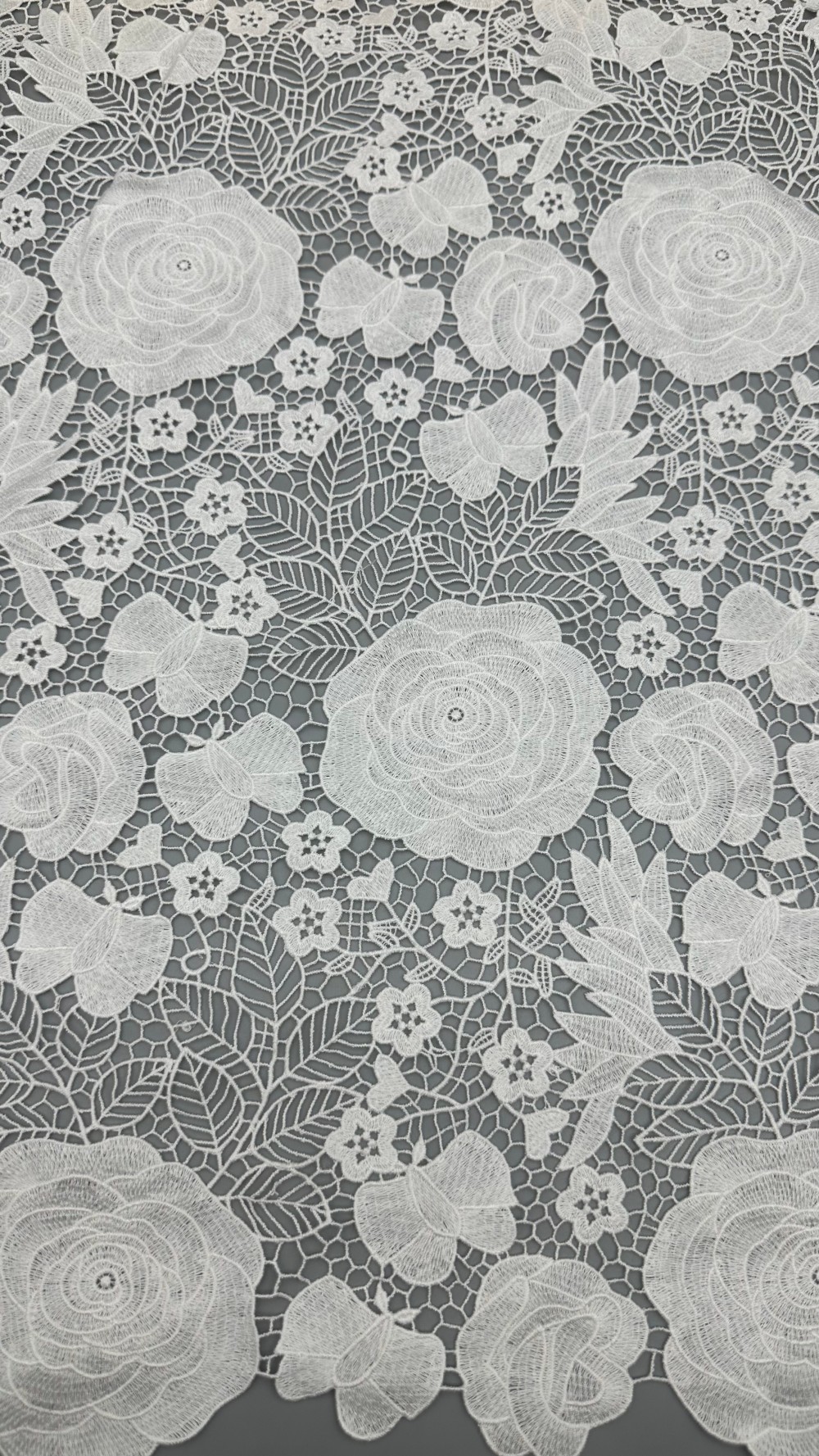 The Embroidered Lace Fabric comes in a beautiful white color, and its embroidered pattern gives it a unique and elegant look. This product is perfect for use in modern designs, as it will add a touch of sophistication to any garment or home textile.